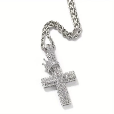 European & American Full Zirconium Crown Cross Pendant Necklace for Men, Copper, Synthetic Zirconia Inlay, Hip Hop, Punk, Trendy, Unique Generation